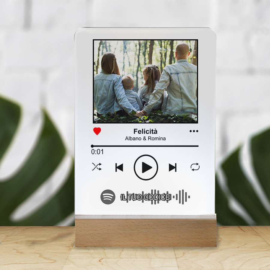 Tutti abbiamo una canzone che non smetteremmo mai di ascoltare o un pezzo che ci ricorda una persona speciale. Sei vuoi materializzare su una cornice in plexiglass la “vostra canzone”, ora puoi farlo con la nostra Cornice in plexiglass Spotify con basetta in legno personalizzabile con la vostra foto, il titolo e l' autore della vostra canzone preferita.